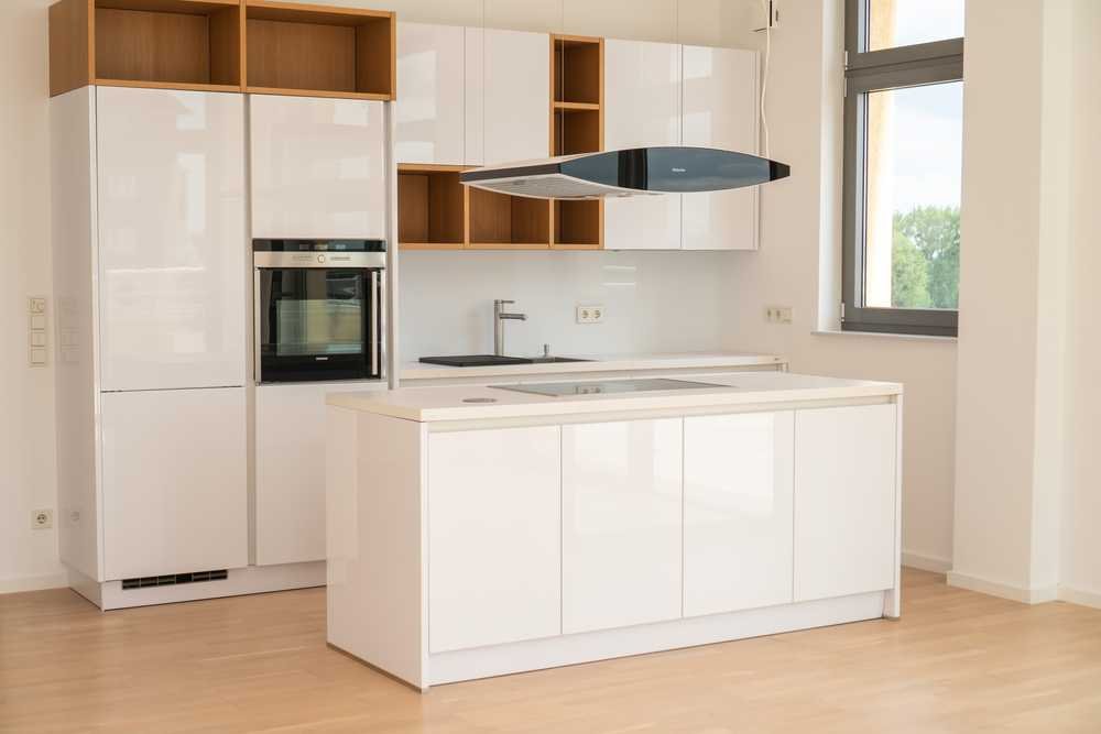 Das Wohnzimmer verfügt über eine moderne Einbauküche inkl. einer Kochinsel und namenhaften Elektrogeräten.