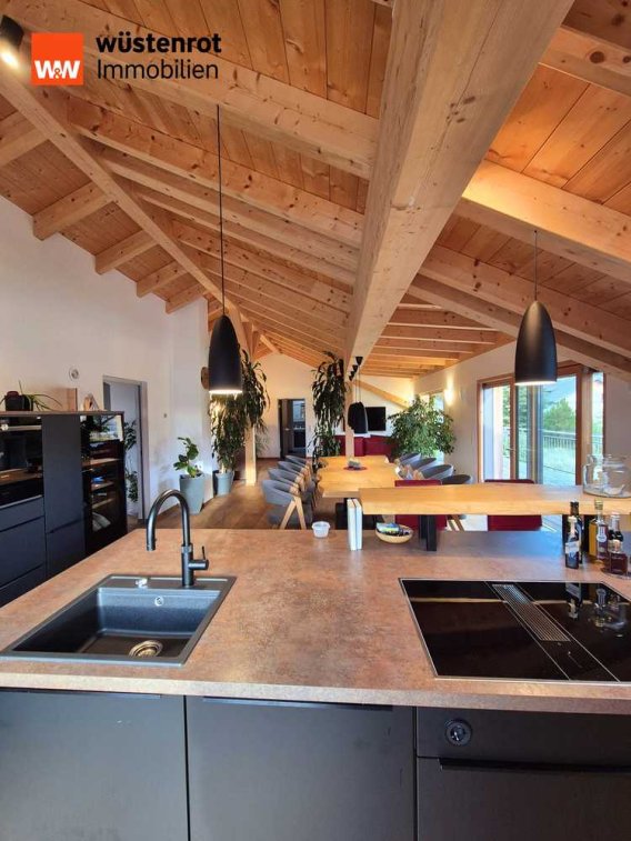 Mittelpunkt dieser beeindruckenden Penthouse-Wohnung ist der riesige Wohn-Essbereich mit integrierter Küche und einem schönen Sichtdachstuhl so wie Zugängen zu der großen Terrasse und einem weiteren Balkon. Hier können Sie entspannen, die Seele baumeln lassen, Ihren eigenen Wellnessbereich kreieren und die Sonne genießen. Bodentiefe großzügige Schiebetüren aus Lärchenholz mit Alu-Außenschale sorgen für viel Licht und tolles Wohnambiente. Der Sichtdachstuhl in Kombination mit den anderen sehr hochwertigen Materialien die verbaut wurden, sorgt für eine gemütliche Wohlfühlatmosphäre.