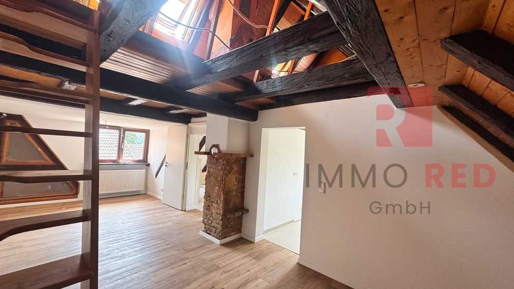 Die freigelegten Holzbalken, das warme Holz der Deckenverkleidungen und der rustikale Mauerrest des alten Schornsteins verleihen der Wohnung ein außergewöhnliches Ambiente. Durchdachte Modernisierungen sorgen dabei für zeitgemäßen Wohnkomfort.