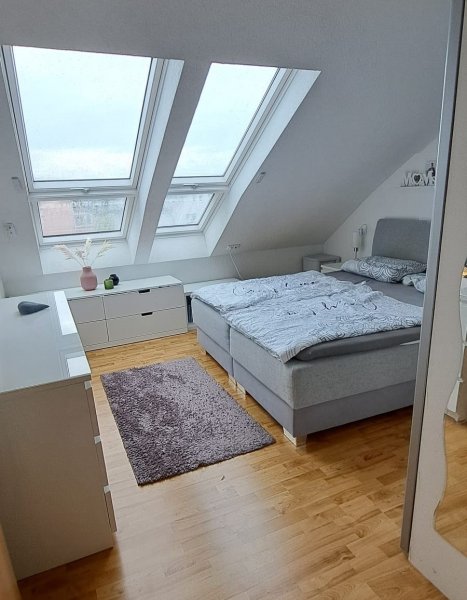 Das Herzstück dieser charmanten Dachgeschosswohnung ist das ca. 35 m² große Wohnzimmer – ein lichtdurchfluteter, offener Raum mit charmanten Dachschrägen und modernen Dachfenstern. Hier finden Wohn-, Ess- und Lebensbereich großzügig Platz. Die gelungene Raumaufteilung schafft ein behagliches und gleichzeitig modernes Wohngefühl.