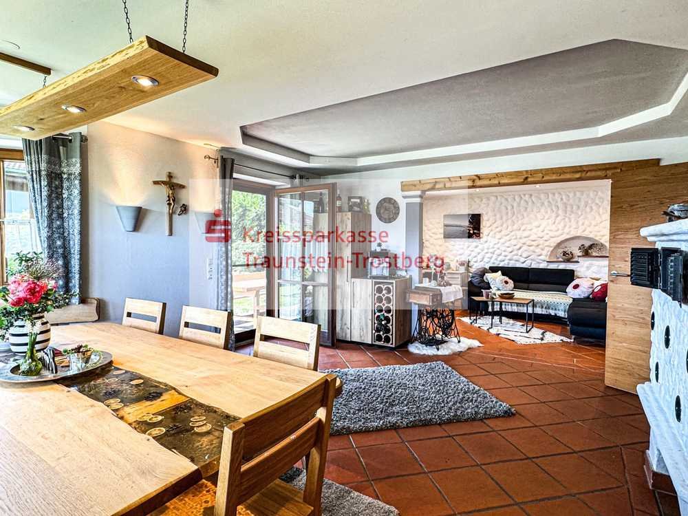 Der gemauerte Kachelofen im großzügigen Wohn-Esszimmer schafft an kalten Tagen eine gemütliche Wärme und senkt Ihre Heizkosten. Der Einsatz für den Kachelofen wurde erst in 2024 ausgetauscht.
