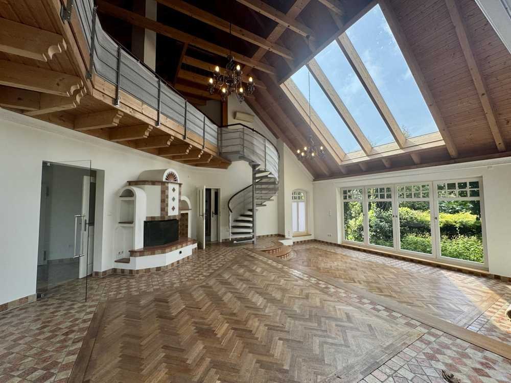 Das 2003 erbaute Wohnhaus beeindruckt bereits beim Betreten durch seine Offenheit und die klare Formensprache. Der großzügige Wohn- und Essbereich mit Blick auf die Sonnenterrasse und den Garten bildet das Herzstück des Hauses. Hohe Fensterflächen lassen viel Tageslicht herein und schaffen ein elegantes, aber zugleich einladendes Wohngefühl. Eine Wendeltreppe führt in die offene Galerie im Obergeschoss, die den Wohnbereich auf architektonisch ansprechende Weise ergänzt.