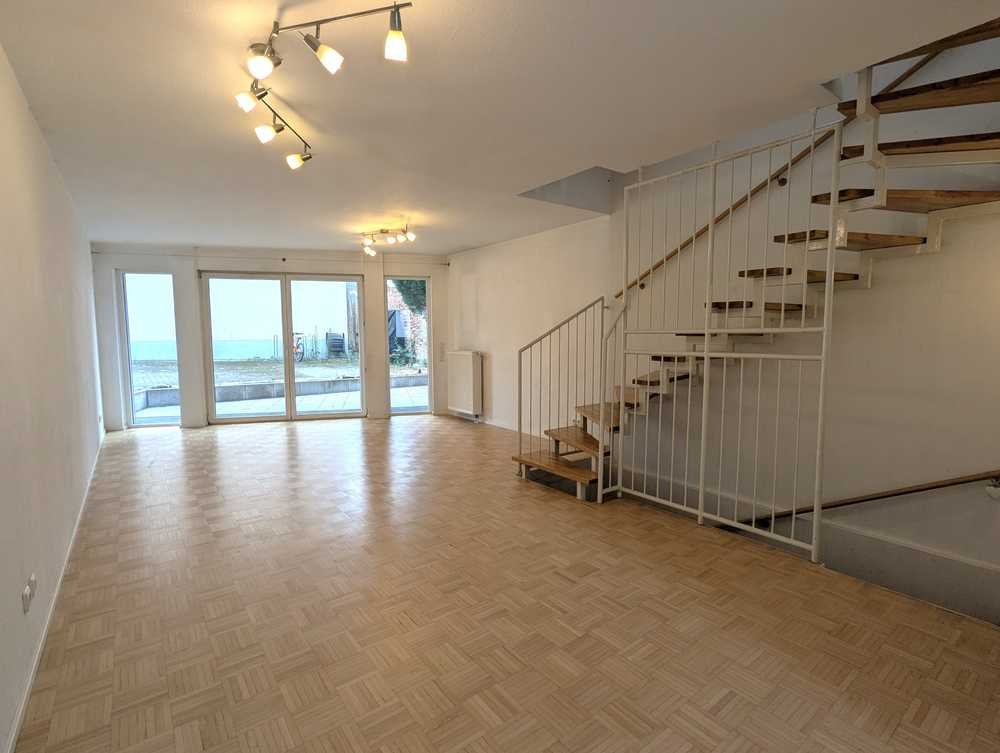 Im Erdgeschoss befinden sich ein Gäste-WC im Eingangsbereich, ein großzügiges, helles Wohnzimmer, sowie die Küche. Vom Wohnzimmer aus gelangt man auf die kleine Terrasse mit Zugang zum Außenbereich.