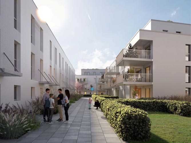 Die stilvolle Architektur mit klaren Fassaden und markanten Putzstrukturen interpretiert ländliches Wohnen neu und schafft durch versetzte Fassadenbereiche individuelle Rückzugsmöglichkeiten. Ein begrünter öffentlicher Platz und ein Kinderspielplatz fördern die Nachbarschaftsgemeinschaft, während die autofreie Gestaltung des Quartiers für Ruhe und Sicherheit sorgt. Die Tiefgarage bietet ausreichend Parkmöglichkeiten und ist mit einem Lademanagementsystem sowie optionaler Wallbox ausgestattet.