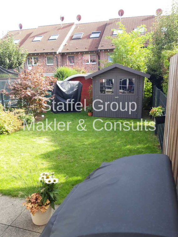 Das Grundstück umfasst ca. 187 m². Im vorderen Bereich steht ein Carport, davor gibt es Platz für einen Zweitwagen.Im pflegeleichten Garten breitet sich eine großzügige Terrasse mit Sichtschutz zu beiden Seiten aus, begleitet von einer Gartenlaube zum Unterstellen von Gartengeräten.