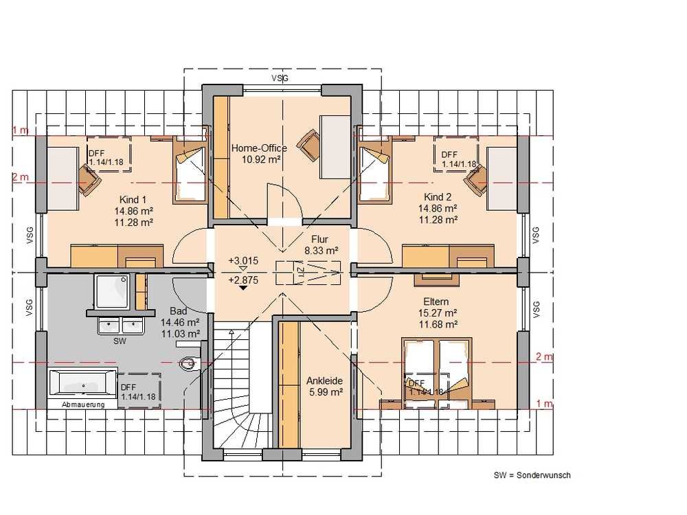 Das Dachgeschoss bietet zwei große Kinderzimmer, ein Home-Office und das Eltern-Schlafzimmer mit separater Ankleide. Das Badezimmer wird aufgrund der Größe und Aufteilung schnell zur individuellen Wellness-Landschaft.