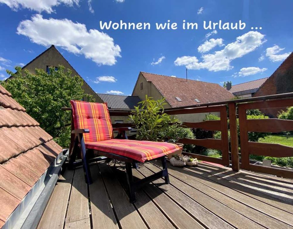 Zum entspannten Sonnenbaden lädt die schicke Terrasse ein und bietet gleichzeitig eine Aussicht auf das schöne Grundstück mit grüner Wiese, Bäumen und vielfältiger Bepflanzung.