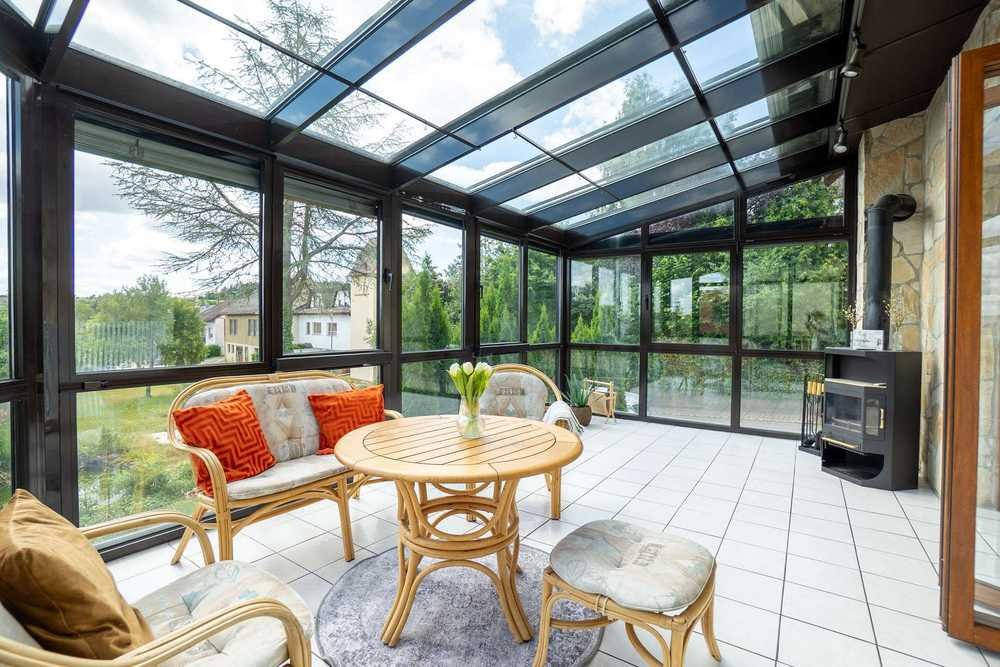 Die Küche ist an das Esszimmer angeschlossen und überzeugt mit einem durchdachten Schnitt. Der Übergang zum lichtdurchfluteten Wintergarten mit Ofen macht diesen Teil des Hauses zu einem besonderen Highlight: Hier genießen Sie zu jeder Jahreszeit einen wunderschönen Blick ins Grüne.