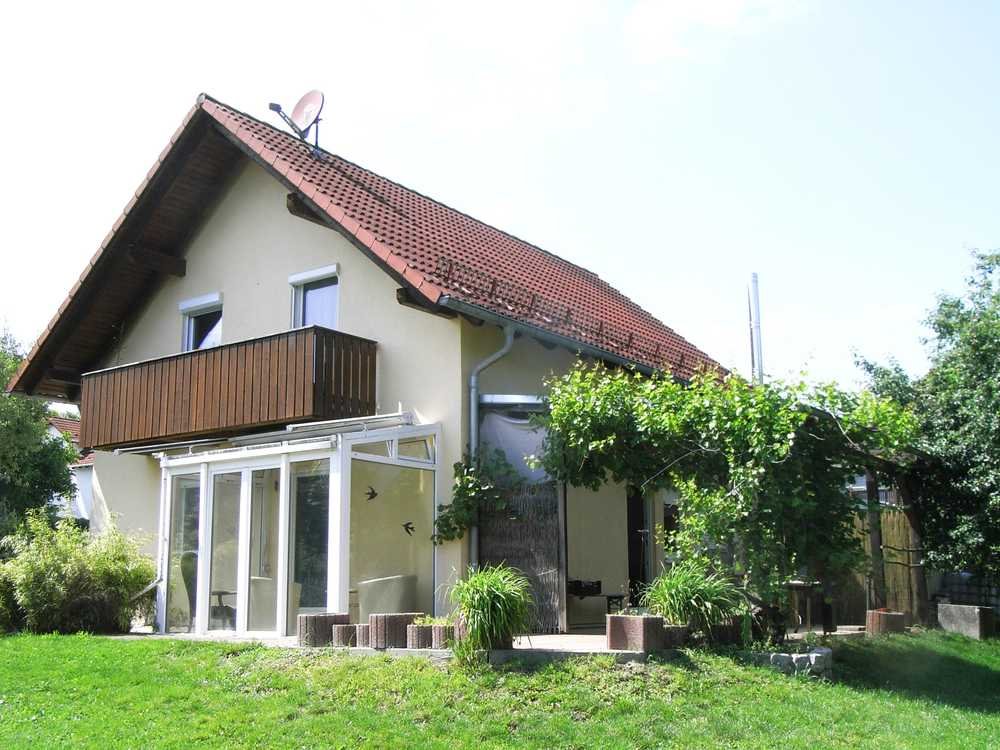 geräumiges Einfamilienhaus (Fertighaus-Ex-Norm) mit viel Platz an. Es präsentiert sich in einem technisch wie optisch gepflegten Zustand. Kleinere Ausbesserungsarbeiten wie: Malern und evtl. Erneuerung des Holzbalkones sind empfehlenswert. Das Haus ist voll unterkellert und verteilt sich über Erdgeschoss und Dachgeschoss. Insgesamt verfügt das freistehende Einfamilienhaus über 4 Schlafzimmer, wobei sich eines davon im Erdgeschoss befindet. Die Wohn- und Schlafräume sind mit Laminatböden ausgestattet. Hervorzuheben ist der große Terrassenbereich sowie der eingewachsene und uneinsehbare Garten mit Blick ins Grüne, wo Sie Ihre Privatsphäre genießen können.