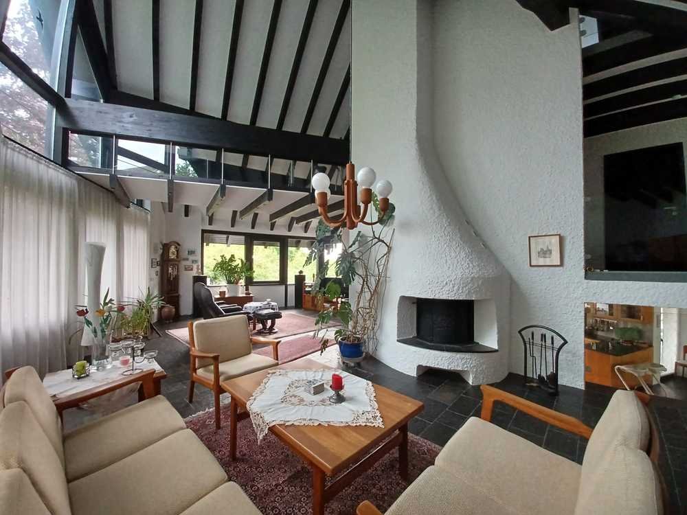 Der angrenzende Wohnbereich auf der nächsten Ebene mit Kamin mit einer Raumhöhe von 6,50 m (!) bietet ein warmes, einladendes Ambiente an kühleren Tagen.
