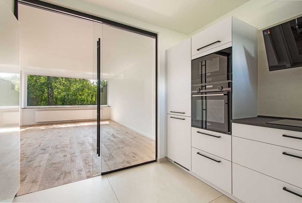 Im Zentrum steht der großzügige Wohnbereich, der sich durch elegante Flügeltüren mit der offenen Küche verbinden lässt. Diese ist ein echtes Highlight: mattweiße Fronten, eine klare Linienführung und hochwertige Markengeräte von Siemens fügen sich zu einer perfekten Kombination aus Design und Funktion. Die Küche bietet viel Raum für gemeinsames Kochen und Genießen und lässt sich bei Bedarf dezent vom Wohnraum trennen – ohne den offenen Charakter zu verlieren.