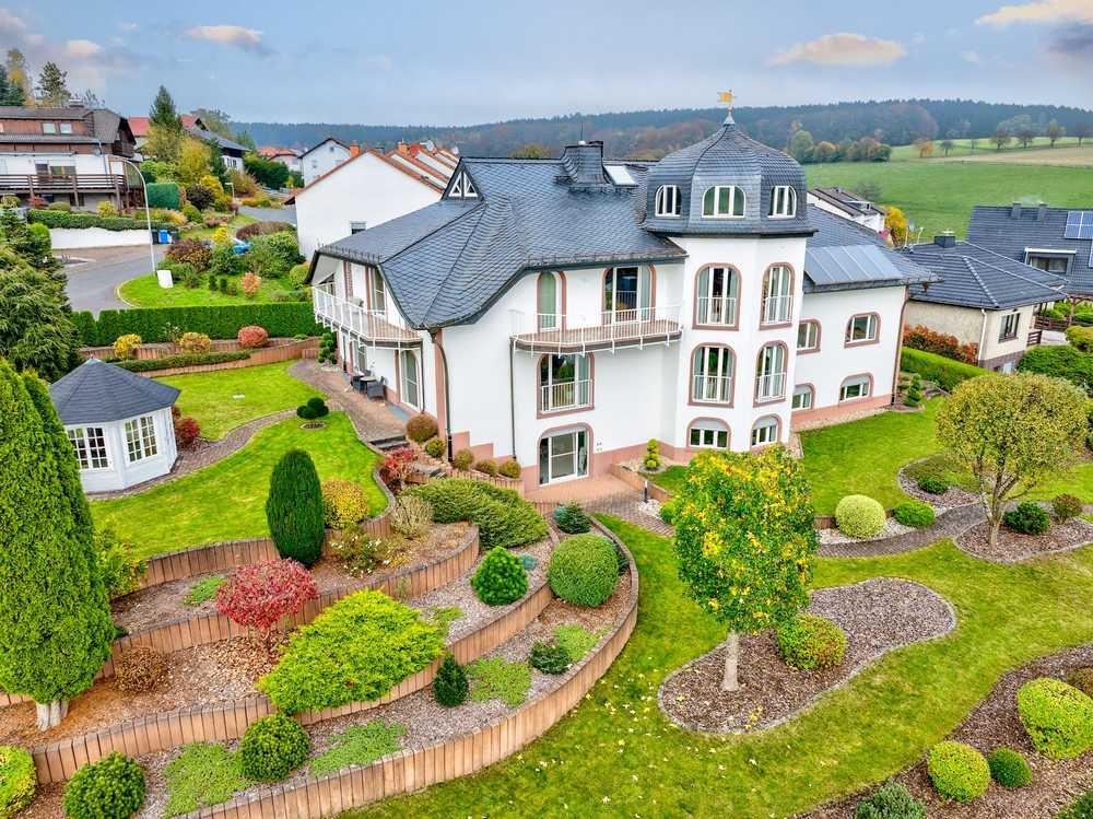 Mitten im Naturpark Spessart, in einer der schönsten Lagen rund um Bad Orb, erhebt sich ein Anwesen von außergewöhnlichem Charakter – ein Ort, der zeitlose Eleganz mit diskretem Luxus auf besondere Weise vereint. Schon beim ersten Blick über den Garten hinweg offenbart sich die beeindruckende Architektur, deren Stil sich konsequent in der Raumaufteilung und hochwertigen Innenausstattung fortsetzt.