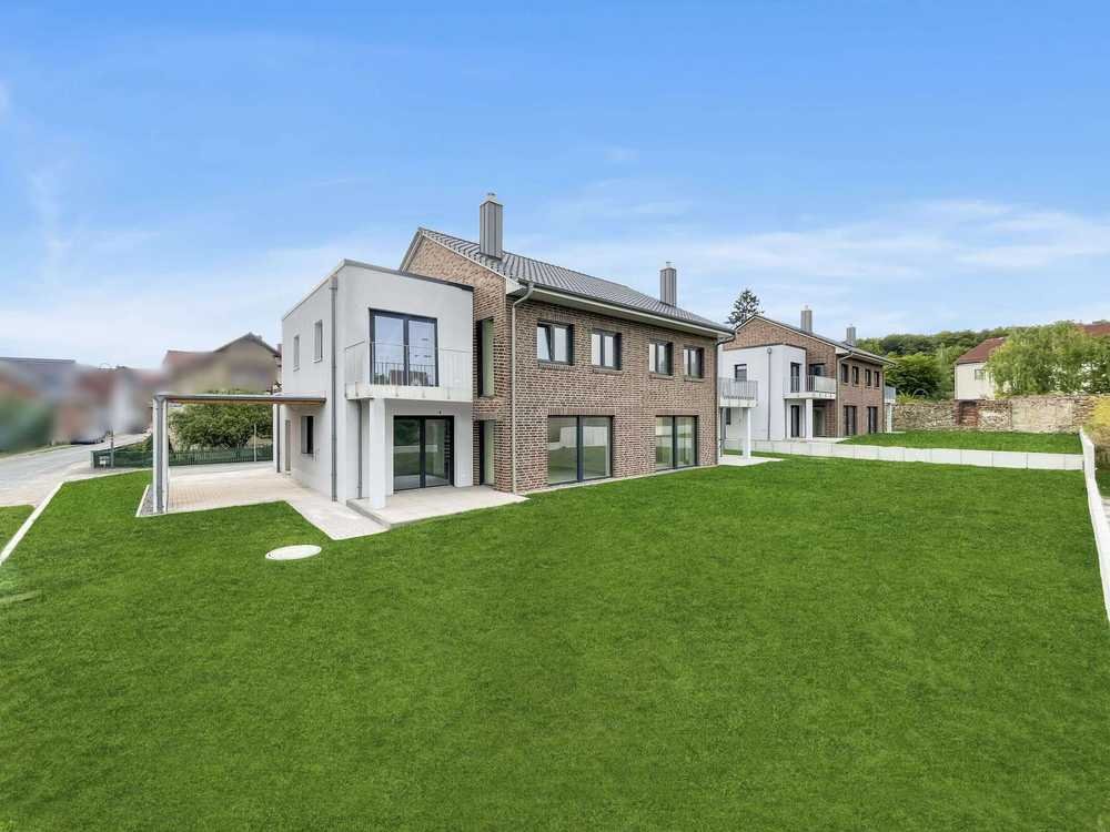 Die neu gebaute Doppelhaushälfte, errichtet im Jahr 2023, vereint modernste Bauweise mit einem ästhetisch ansprechenden Design. Die Fassade ist harmonisch gestaltet und kombiniert teils Klinker mit edlem Putz, was dem Haus eine zeitlose Eleganz verleiht. Als KfW-55-Effizienzhaus ist es energieeffizient und mit einer modernen Wärmepumpe ausgestattet, die für die umweltfreundliche Fußbodenheizung sorgt. Zusätzlich sorgen elektrische Rollläden und ein Glasfaseranschluss für hohen Wohnkomfort.