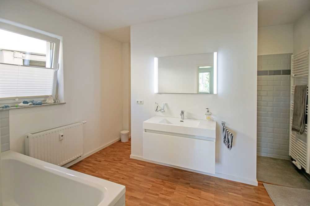 Das moderne Tageslichtbad ist mit einer Badewanne, einer ebenerdigen Dusche sowie einem Waschmaschinenanschluss ausgestattet. Von der Küche aus betritt man eine kleine Terrasse mit Blick in den Gemeinschaftsgarten – ein Ort der Erholung mit Pool und Außenküche.