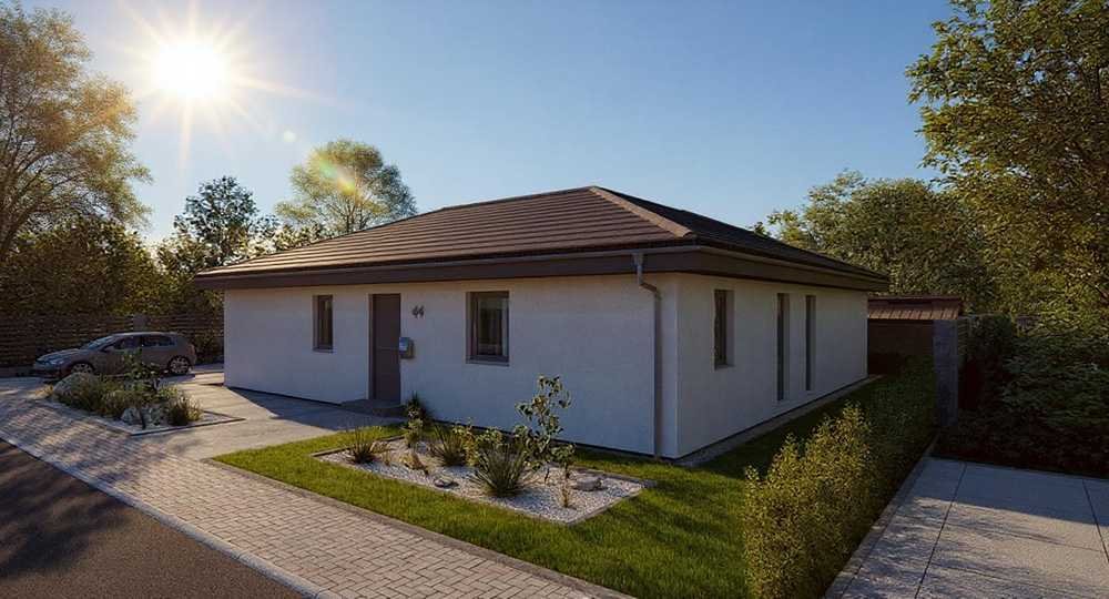 Die beispielhafte Bebauung umfasst einen stilvollen Bungalow, der sich ideal für kleinere Grundstücke eignet und dennoch durch seine durchdachte Architektur ein großzügiges Raumgefühl vermittelt.