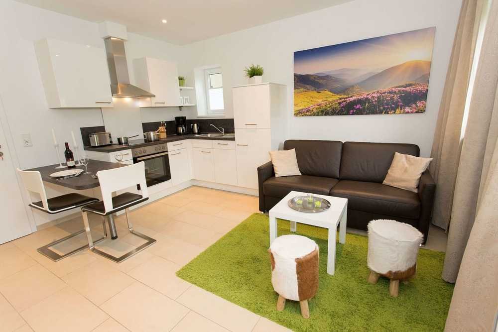 Alle 4 Wohnungen verfügen über eine jeweils voll ausgestattete Küche, Essbereiche mit Tisch und Stühlen, Wohnzimmer mit Fernsehern und diversen Sitzgelegenheiten, hell und freundlich gestaltete Schlafzimmer inkl. Betten & Schränken und moderne Bäder.