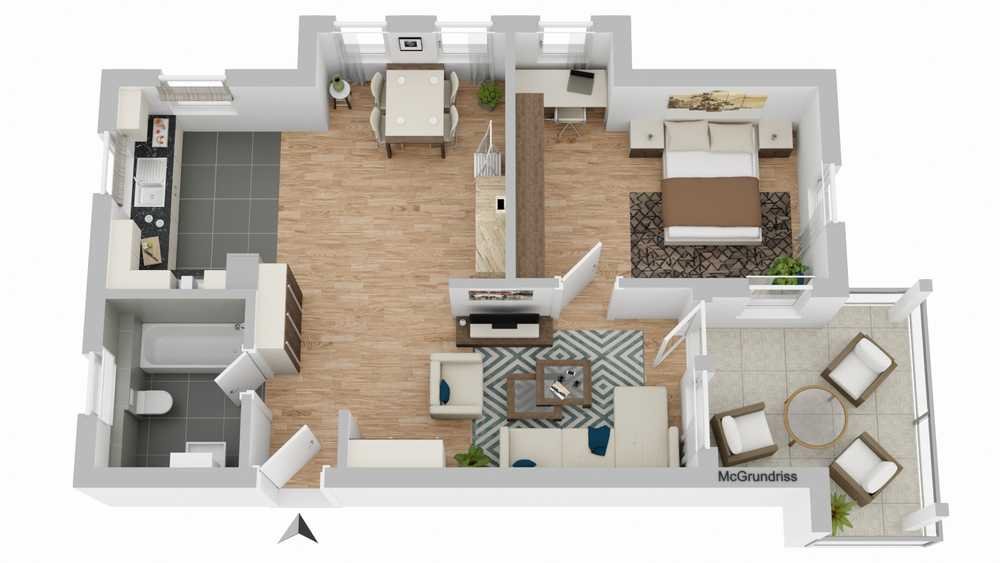 Beachten Sie unsere Möblierungsvorschläge, die die Variabilität dieser hübschen kleinen Wohnung aufzeigen. Mit ganz wenig Aufwand lässt sich hier das eigene Paradies schaffen …