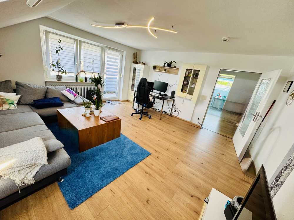 Das lichtdurchflutete Wohnzimmer bietet Zugang zu einem gemütlichen Balkon, der ideal für entspannte Stunden im Freien ist. Die moderne und helle Einbauküche ist in den Raum perfekt integriert und bietet viel Stauraum.