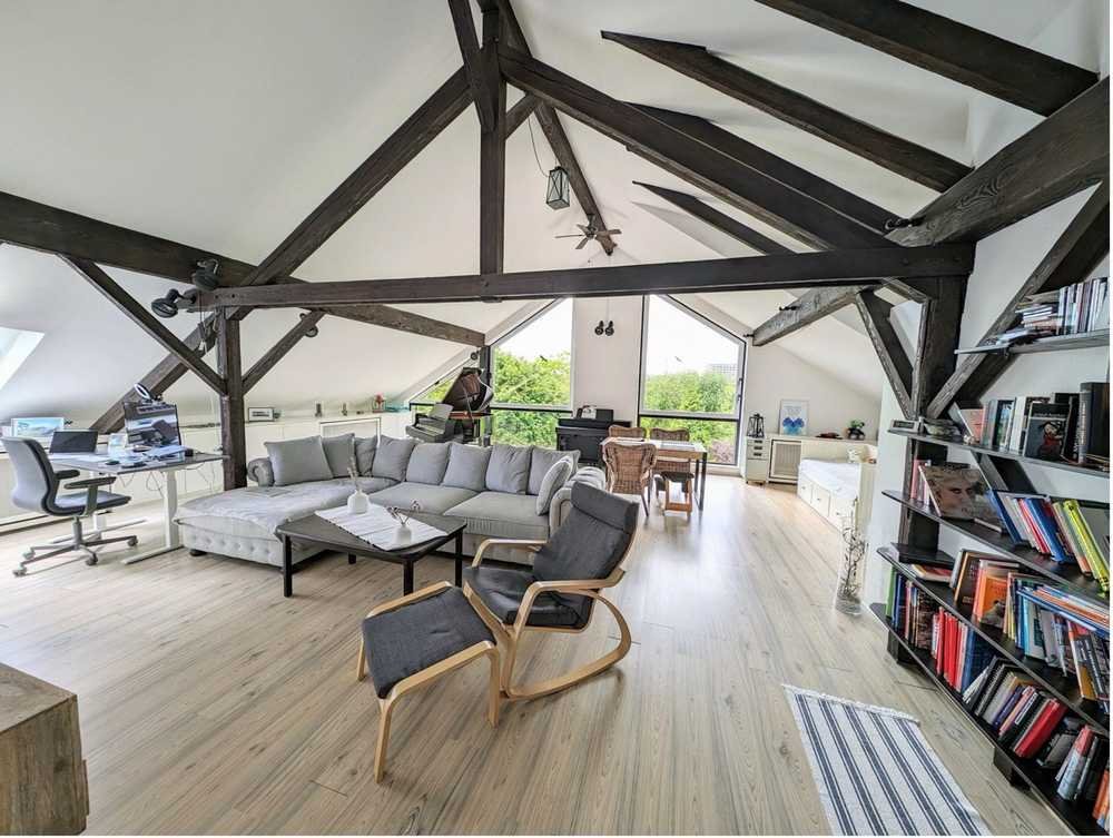Herzstück ist der rund 70 m² große Wohnbereich mit offenen Decken, sichtbaren Holzbalken und großen Fensterfronten – ein lichtdurchfluteter Raum mit loftartigem Charakter. Die Fläche lässt sich flexibel nutzen oder unterteilen, z. B. für Kinderzimmer oder Homeoffice.