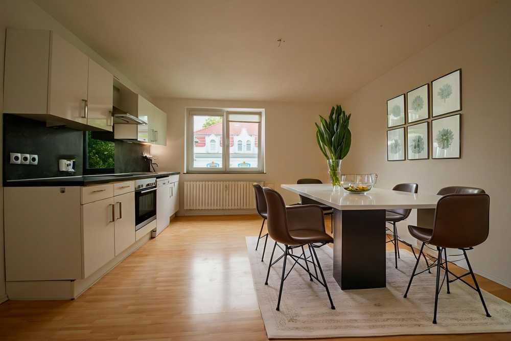 Das großzügige Wohnzimmer sowie das ebenfalls geräumige Schlafzimmer bieten vielfältige Einrichtungsmöglichkeiten. Das Tageslichtbad wurde im Jahr 2018 modernisiert und verfügt über eine Badewanne – ideal für entspannte Momente. In der Küche findet sich ausreichend Platz für einen Esstisch, perfekt für gemeinsame Kochabende mit Familie oder Freunden.