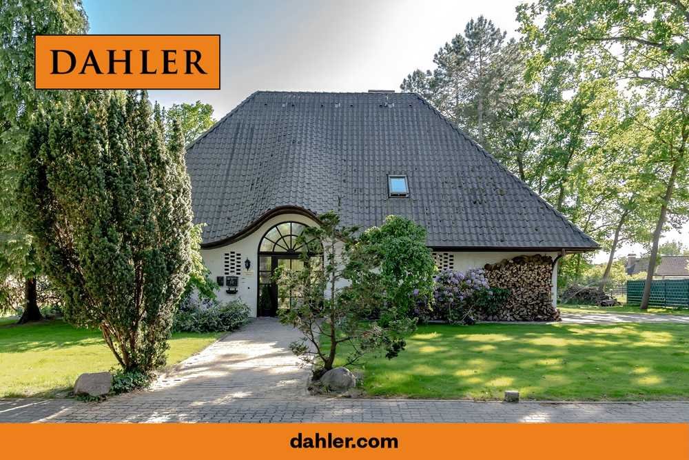 Das Haus beeindruckt durch seine klare Grundrissgliederung und das bemerkenswerte nach Südwesten ausgerichtete weitläufige Grundstück, dass real teil- und bebaubar ist. Stilprägend sind die Fledermausgauben des Daches sowie der sich halbrund in den Garten nach Süden erstreckende großzügige und helle Wohnbereich über zwei Ebenen.
