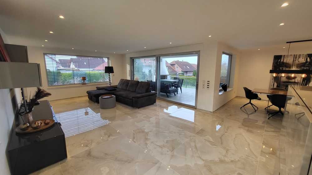 Die hochwertige Einbauküche der Marke Nobilia ist mit Miele- und Siemens-Elektrogeräten ausgestattet und lässt keine Wünsche offen. Die moderne Küche ist ebenso wie der Wohnbereich über das offene Treppenhaus erreichbar.