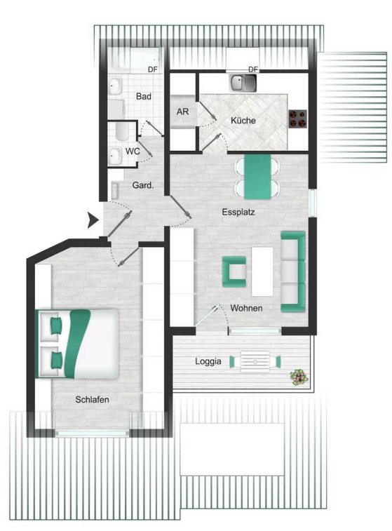 2 Zimmer Dachgeschosswohnung mit Balkon, Einbauküche und Tiefgaragenstellplatz
