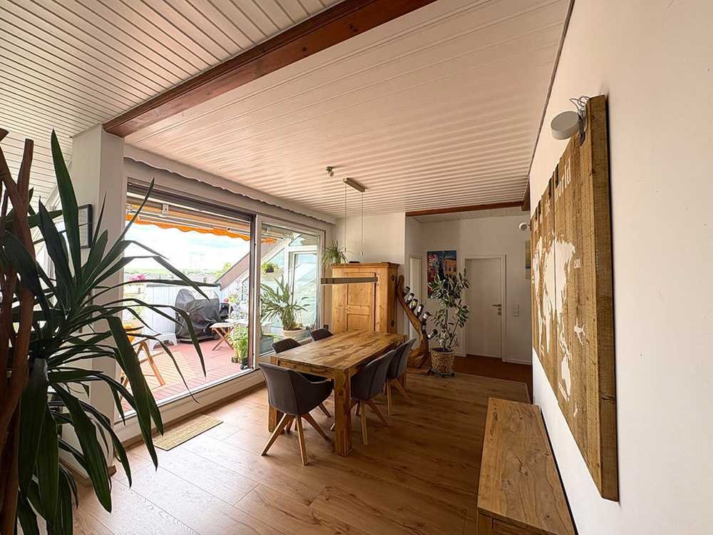 Ein großzügiger Eingangsbereich mit Garderobennische führt Sie direkt in das Herzstück der Wohnung: den lichtdurchfluteten Wohn- und Essbereich mit Zugang zur ruhig gelegenen Dachterrasse.