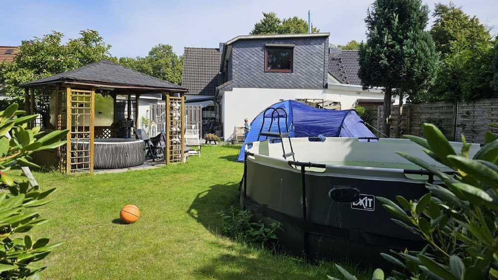 Das weitläufige Grundstück mit Westausrichtung verwöhnt Sie den ganzen Nachmittag und Abend mit Sonne. Eine dichte Bepflanzung sorgt für Privatsphäre. Ob gemütliche Grillabende im festen Holzpavillon, ein Pool, Spielflächen für Kinder oder liebevoll angelegte Gemüsebeete hier ist alles möglich. Zum Feierabend lädt die große Terrasse am Haus zu entspannten Stunden im Freien ein.