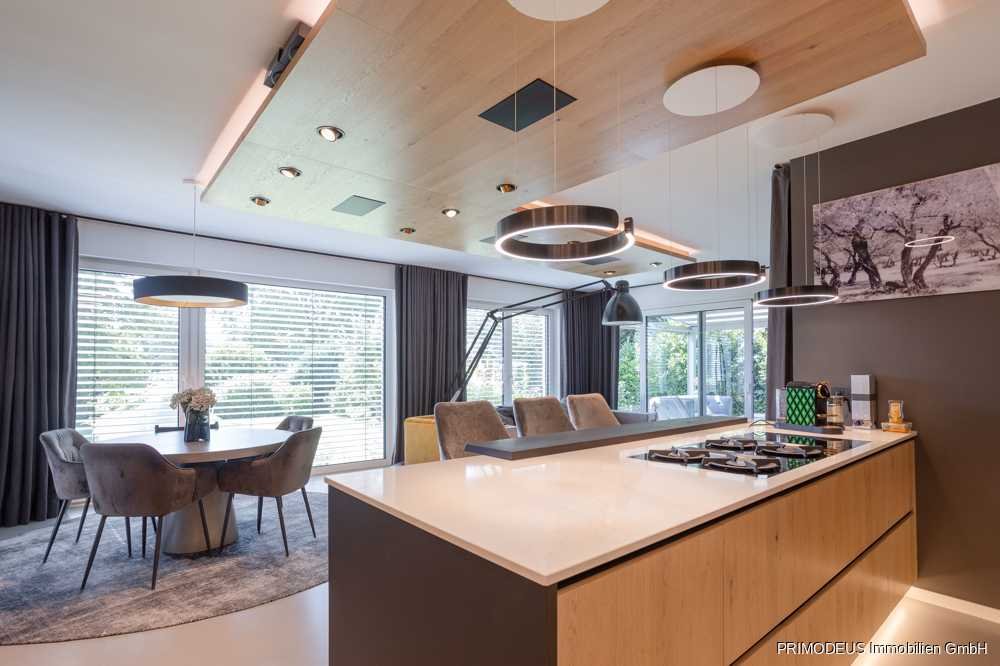 Ein absolutes Highlight ist die maßgefertigte Schreinerküche, ausgestattet mit hochwertigen Geräten von Gaggenau und Miele, einem Bora-Kochfeld, Gasherd sowie einer Britta-Filteranlage. Allein die Schreinerarbeiten hatten einen Investitionswert von über 214.000 €, was die herausragende Qualität eindrucksvoll unterstreicht. Für ein edles Ambiente sorgen elegante Occhio-Leuchten, während ein integriertes Sonos-Soundsystem im gesamten Wohnbereich für exzellenten Klang sorgt.