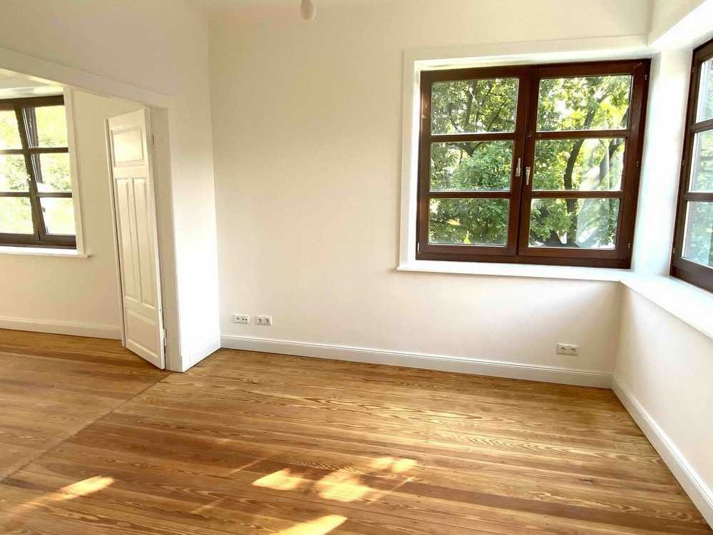 Ein besonderes Alleinstehungsmerkmal ist die große Doppelflügeltür, die die beiden vorderen Räume verbindet. Zusammen mit den Über-Eck-Fenstern versprühen die Räume ein nostalgisches Flair.