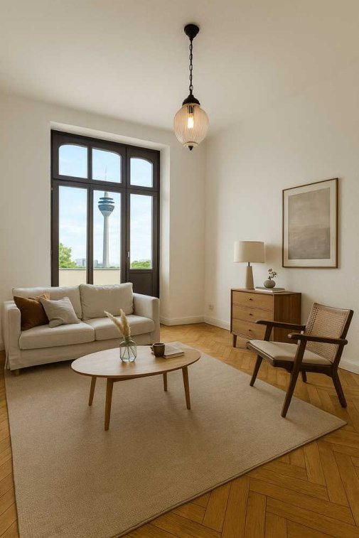 In der ersten Etage dieses aufwendig sanierten Altbaus im Düsseldorfer Medienhafen befinden sich lichtdurchflutete Wohnungen mit durchdachter Raumaufteilung und hochwertiger Ausstattung. Das absolute Highlight ist das bodentiefe Wohnzimmerfenster mit Zugang zum Balkon – von hier aus eröffnet sich ein direkter Blick auf den Rheinturm und die moderne Architektur des Hafens.