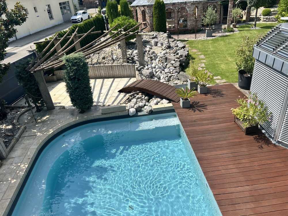 • Pool mit Wasserfallfunktion, solar- oder strombeheizt