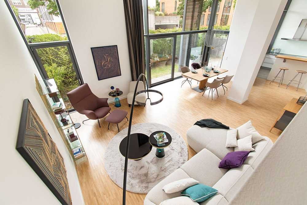 Hochwertige Ausstattungsmerkmale wie edles Parkett, Fußbodenheizung sowie zwei moderne Bäder unterstreichen den exklusiven Wohnkomfort. Große Fenster sorgen für ein helles, offenes Raumgefühl, das durch die loftartige Gestaltung zusätzlich betont wird.