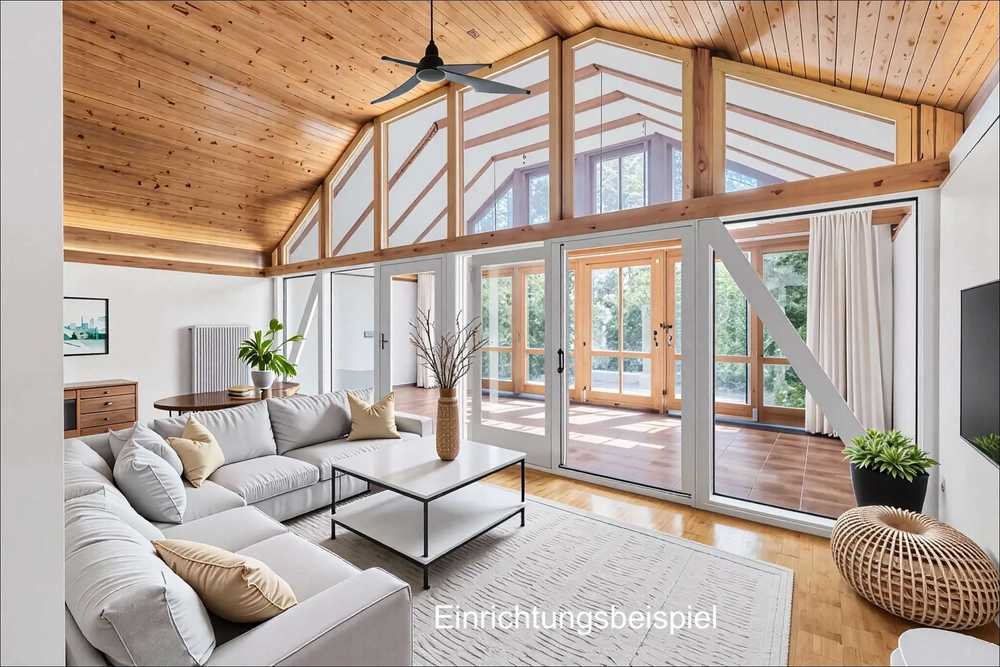 Das freistehende Haus verfügt im Erdgeschoß über ca. 121 m2 Wohnfläche. Diese verteilt sich auf insgesamt 4 Zimmer und einen imposanten Wintergarten. Es gibt 2 Schlafzimmer, 2 Bäder mit WC, ein Arbeits- oder Esszimmer, Küche und die großzügige Diele. Das Highlight ist das knapp 4 Meter hohe Wohnzimmer mit dem angrenzenden beheizten Wintergarten. Zusätzlich bietet die großzügige Süd-Ost Terrasse reichlich Platz für Erholung.