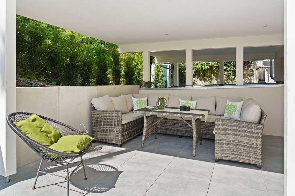 Die Terrasse mit großformatigen Feinsteinzeugfliesen, Überdachung und Einbaustrahlern wird im Sommer zum erweiterten Wohnzimmer – uneinsehbar und mit herrlichem Blick ins Grüne.