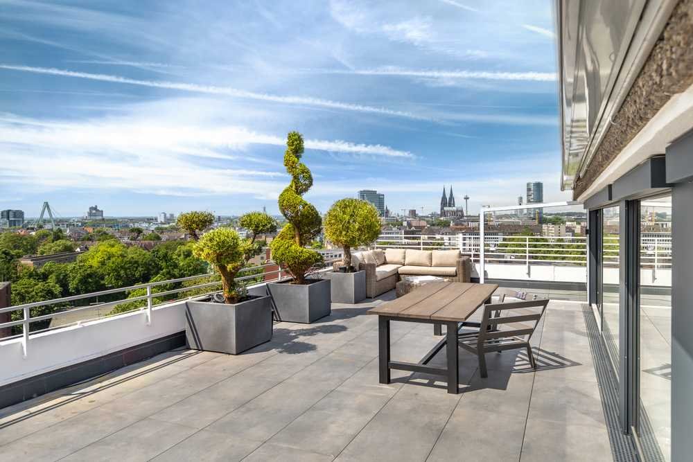 Die angebotene Penthouse-Maisonette erstreckt sich über die die beiden obersten Etagen (11. und 12. Stock) eines Mehrparteienhauses und vereint urbanes Lebensgefühl, Privatsphäre und hochwertige Ausstattung. Das Highlight der Immobilie sind zwei uneinsehbare, südwestlich ausgerichtete Terrassen mit jeweils über 100 m² Fläche, die einen unvergleichlichen Rundumblick über das Kölner Stadtpanorama, inklusive Dom, Kranhäuser, die Lanxess Arena bis hin zum Siebengebirge ermöglichen. Teilbereiche der Terrassen sind mit echtem Rasen ausgestattet und erzeugen so eine gartenähnliche und einzigartige Atmosphäre in luftiger Höhe.