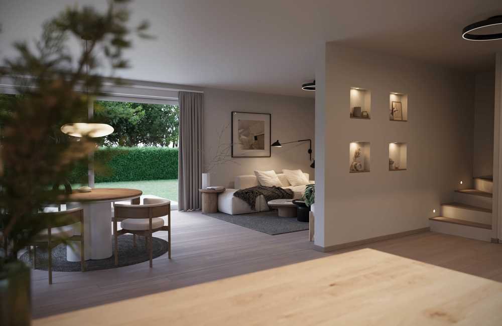 Im Erdgeschoss empfängt Sie ein großzügiger, offen gestalteter Wohn-, Ess- und Kochbereich – der Mittelpunkt des Hauses und Treffpunkt für die ganze Familie. Große Fensterflächen lassen viel Tageslicht herein und schaffen eine helle, freundliche Atmosphäre. Hier ist Platz für gemeinsames Kochen, gesellige Abende mit Freunden und entspannte Momente im Alltag.