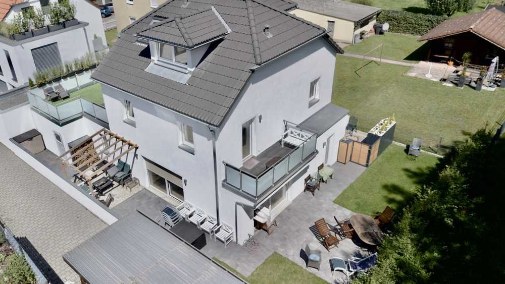 Gebaut im Jahr 2017 und vom Inhaber 2022-2023 renoviert, bietet dieses einmalige Objekt, abseits (hinteres Grundstück) von einer Spielstraße, u.a. einen schönen Garten mit einer Hauptterrasse auf seiner südöstlichen Seite sowie gemütliche Sitzgruppen auf zwei der anderen drei Seiten. Zu den Außenanlagen gehören zudem auf der nordwestlichen Seite des Hauses ein 20 qm großer „Garten“ auf dem Dach der Garage, die an eine 20 qm Dachterrasse angrenzt, und schließlich auch ein 7 qm großer Balkon auf der südöstlichen Seite, alles mit einer hochwertigen Edelstahl- und Milchglas-Brüstung. Realisierung des Anbaus versetze die 20qm Terrasse z. DG