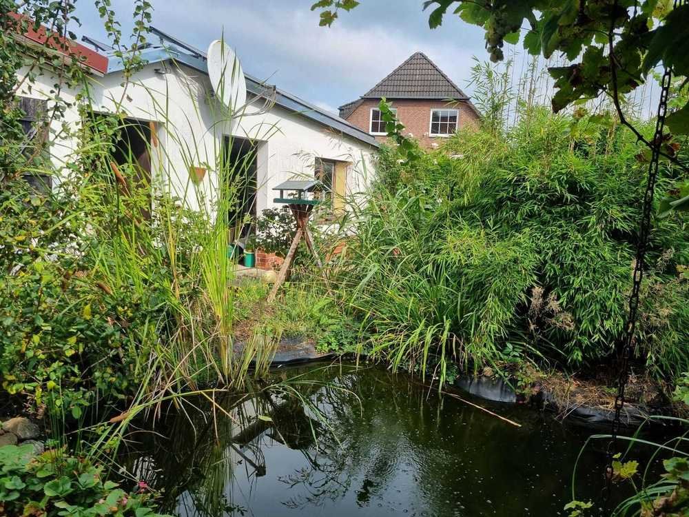 Das Haus steht auf einem großzügigen Grundstück von etwa 700 m², das sogar einen eigenen Teich umfasst.