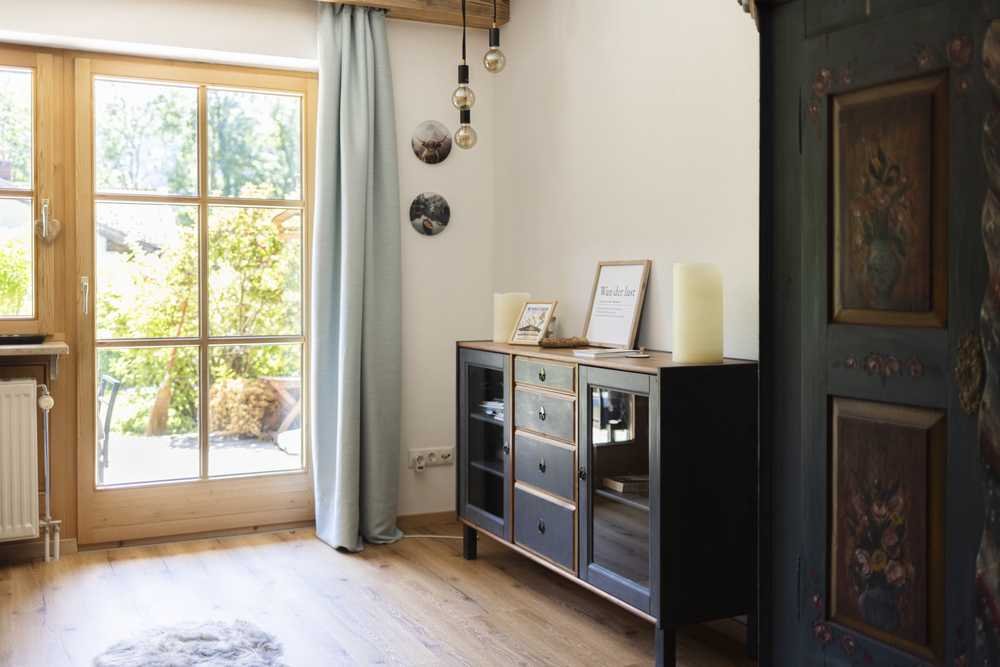 • Wohn- und Essbereich (ca. 24 m²): gemütlich und hochwertig eingerichtet mit modernem Sofa, uriger Esstischgarnitur sowie einem antiken Schrank aus dem 19. Jahrhundert