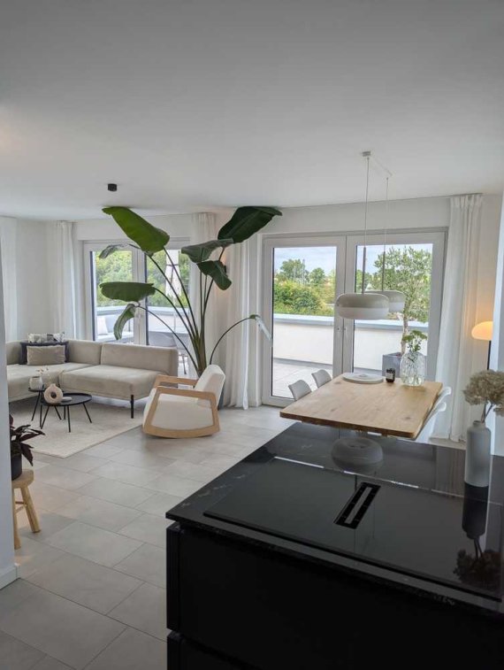 Ein besonderes Highlight sind die beiden großzügigen Dachterrassen, die dieser Wohnung einen einzigartigen Charakter verleihen. Das Wohnzimmer öffnet sich über bodentiefe Flügeltüren zur großen Dachterrasse mit Süd- und Westausrichtung, die in U-Form verläuft. Von hier aus genießen Sie einen freien Blick und traumhafte Sonnenuntergänge. Die zweite Dachterrasse ist vom Büro/Kinderzimmer zugänglich und bietet sonnige Südlage. Darüber hinaus steht Ihnen ein Balkon zur Verfügung, der zusätzliche Rückzugsmöglichkeiten schafft.