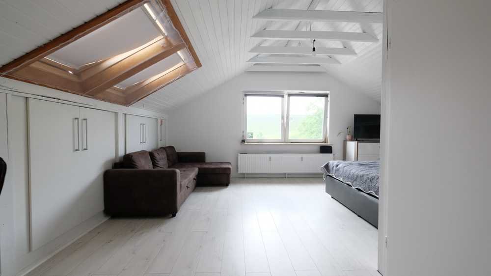 Durch ein Dachflächenfenster sowie ein zusätzliches normales Fenster ist die Wohnung gut belichtet und wirkt insgesamt freundlich und hell. Die Kombination aus praktischer Raumaufteilung und natürlicher Belichtung trägt zu einer an genehmen Wohnatmosphäre bei.