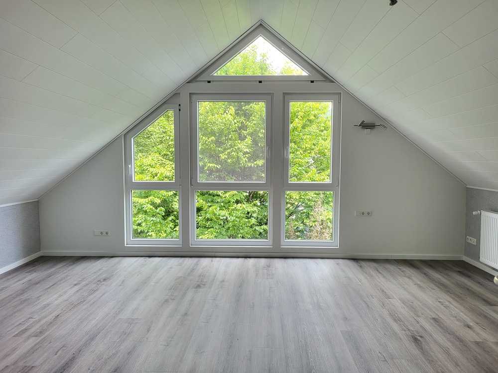 Das Dach haben wir 2020 vollständig erneuert. Im Obergeschoss gibt es ein Arbeitszimmer mit Platz für zwei Schreibtische und ein großes Schlaf-/Kinderzimmer mit hohen Decken, das wir 2021 saniert haben. Dabei wurde auch das Dach von innen neu gedämmt und ausgebaut.