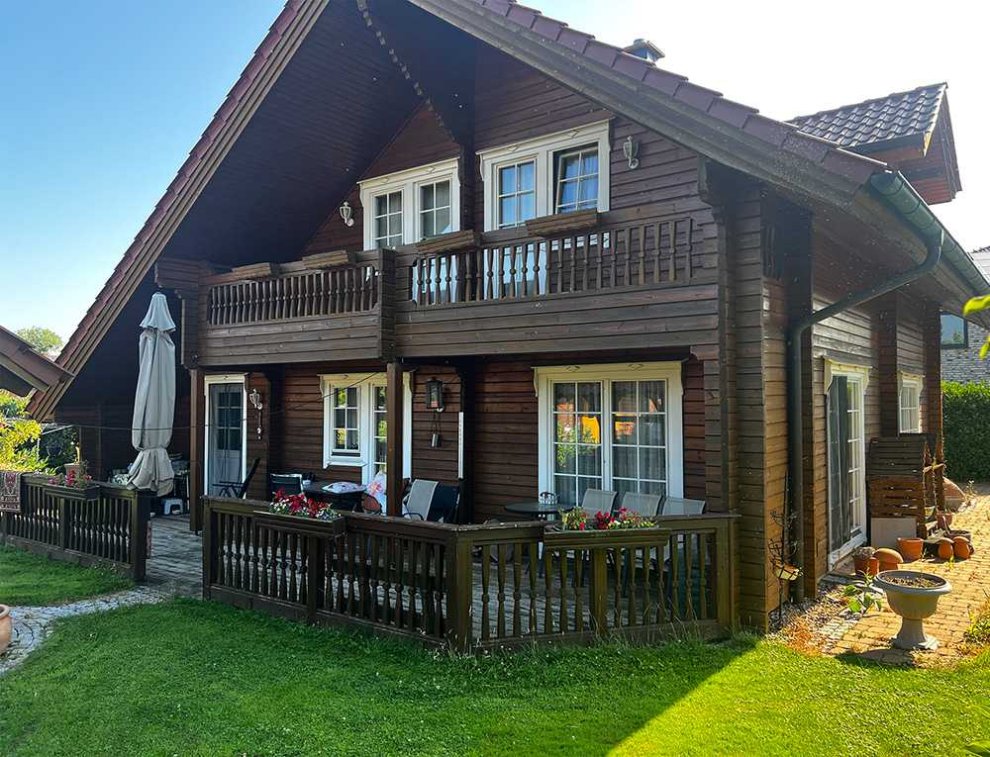 Das angebotene Objekt ist ein Einfamilienhaus errichtet mit Außen-, und Innenwänden aus dem langsam wachsenden Holz der finnischen Kiefer. Diese Polarkiefer kann Feuchtigkeitsschwankungen mit wenig bis gar keiner Rissbildung widerstehen. Die Konstruktion der Außenwände besteht aus einer Doppelblockwand - zweimal 7cm starke Bohlen - mit einer eingelegter Windpappe und 14 cm Wärmedämmung. Der ursprüngliche Eigentümer des Hauses war Zimmermeister, ein ausgewiesener Fachmann, der nicht nur einen gewissenhaften Aufbau gewährleistet hat, sondern auch über die erforderlichen technischen und ökologischen Anforderungen hinausgehende Maßnahmen für sich durchgeführt hat. Geradezu luxuriös sind die breiten Dachüberstände.