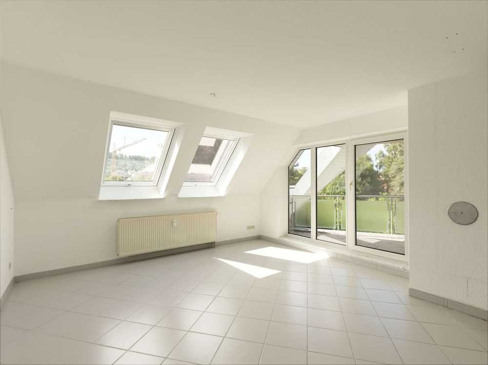 Bereits beim Eintreten empfängt Sie ein freundlicher, offener Flur mit Platz für eine Garderobe und direktem Zugang zu den einzelnen Wohnbereichen. Der großzügige Wohnbereich punktet mit einer angenehmen Helligkeit, die durch die Dachschrägen und großen Fenster unterstrichen wird. Von hier aus gelangen Sie auf den überdachten Balkon, der einen erholsamen Blick ins Grüne bietet – perfekt für entspannte Stunden im Freien.