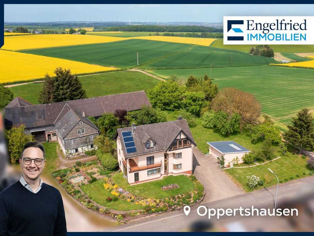 Das Anwesen liegt in ruhiger Feldrandlage im kleinen Ort Oppertshausen (ca. 120 Einwohner). Hier genießen Sie ein naturnahes Umfeld mit traumhafter Aussicht, wohnen aber dennoch verkehrsgünstig: Nur wenige Minuten sind es zur B50 mit schneller Anbindung nach Simmern, Kirchberg, zur A61 und zum Flughafen Hahn.