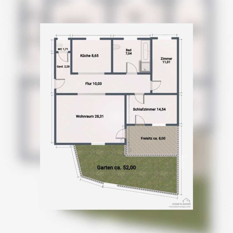 Die Küche (8,65 m²) ist praktisch geschnitten und bietet ausreichend Platz zum Kochen. Ein separates WC (1,71 m²) sowie das Badezimmer (7,04 m²) mit Badewanne & Dusche sorgen für zusätzlichen Komfort. Zwei Schlafzimmer (11,0 m² und 14,5 m²) bieten flexible Nutzungsmöglichkeiten, z. B. als Kinder-, Arbeits- oder Gästezimmer.
