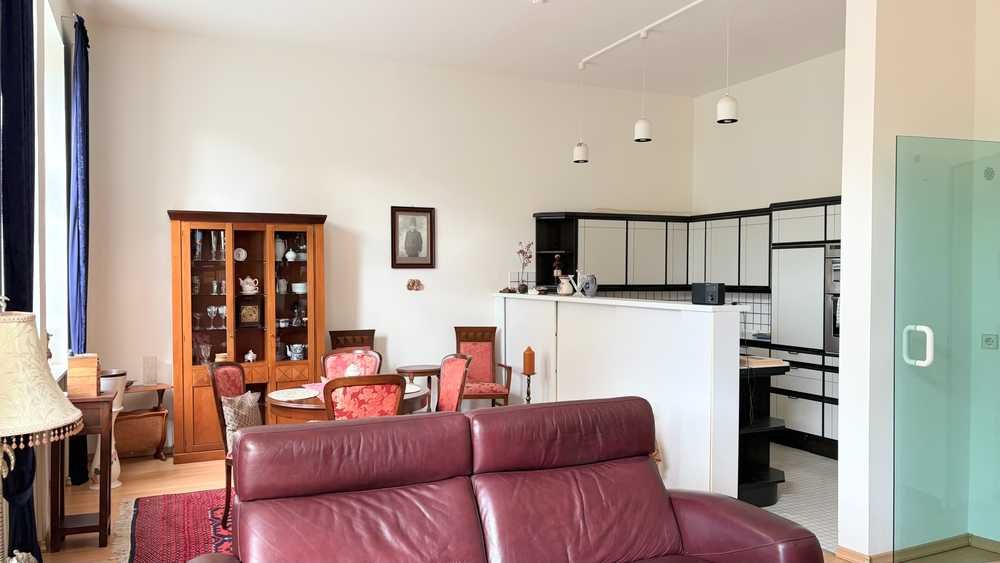 Hohe Decken und große Fenster verleihen den Räumen eine besondere Großzügigkeit und sorgen für viel Helligkeit. Ein Kellerraum steht zusätzlich zur Verfügung und bietet praktischen Stauraum.