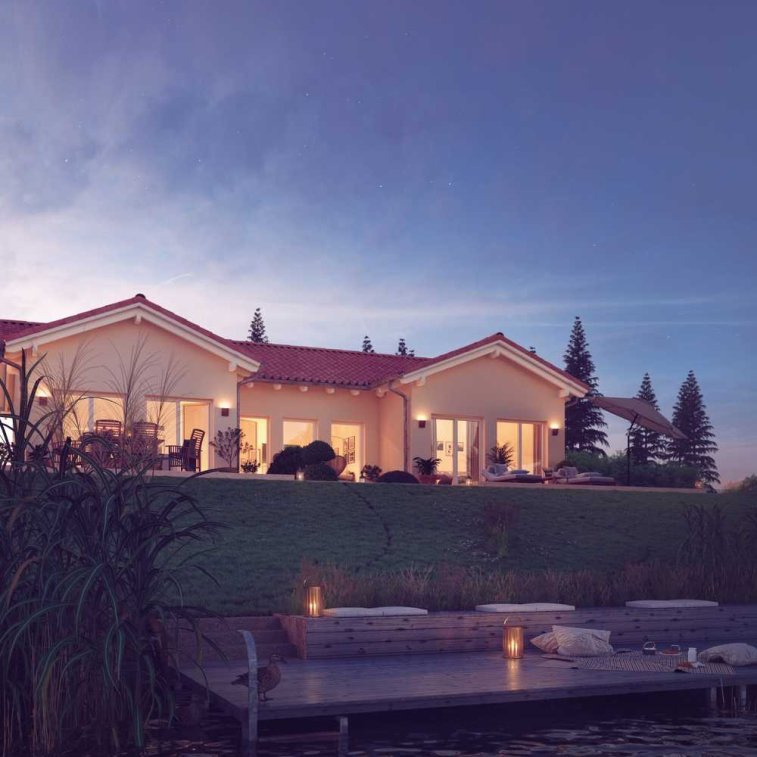 Ein Bungalow eignet sich nur für Singles oder ältere Paare? Keineswegs! Den Gegenbeweis tritt dieser großzügig dimensionierte Entwurf an. Mit einer Wohnfläche von mehr als 130 m² steht er dem Platzangebot eines herkömmlichen zweistöckigen Einfamilienhauses in nichts nach. Dabei bietet er ein Plus an Komfort. So kann auf Treppen, die nicht nur mühselig zu erklimmen sind, sondern auch eine Gefahr für ältere Menschen und Kleinkinder darstellen, komplett verzichtet werden. Stattdessen sind alle Räume ebenerdig angeordnet, was das familiäre Miteinander intensiviert. Die Basis des Fertighauses bildet ein rechteckiger Baukörper, der durch zwei symmetrisch angeordnete Querhäuser erweitert wird. Durch die U-Form entsteht ein gemütlicher Terrassenbereich, der nicht nur vor fremden Blicken, sondern auch vor Wind und starker Sonneneinstrahlung abgeschirmt wird. Gekrönt werden beide Architektur-Bauteile - ebenso wie der Hauptbaukörper - von flach geneigten Satteldächern. Sie verleihen dem Haus einen modernen Landhauslook. Im Zusammenspiel mit einer pastellfarbenen Fassade und einer roten Dacheindeckung entsteht ein mediterranes Flair, das Lust auf Urlaub in den eigenen vier Wänden macht. Ausgedehnte Fensterflächen lassen den Bungalow dabei leicht und transparent wirken und fluten die Innenräume mit natürlichem Licht. Dank der offenen Raumaufteilung kann es sich hier in jeden Winkel ausbreiten. Schon beim Betreten des Hauses fällt der Blick durch die Diele und den Wohn-, Ess- und Kochbereich hindurch bis hinaus in den Garten. An die Küche grenzt ein Technik- bzw. Hauswirtschaftsraum an. Wer den Platz lieber für eine geräumige Speisekammer nutzen möchte, der kann die Heiz- und Haustechnik natürlich auch in einem Keller unterbringen. Über einen schmalen Flur werden die Privaträume erschlossen. Ein luftiger Masterbedroom mit Gartenzugang und begehbarem Kleiderschrank, ein helles Kinderzimmer und ein geräumiges Familienbad lassen Wohnträume wahr werden. Besonders praktisch ist das zweite Bad mit Dusche neben dem Eingangsbereich. Abgerundet wird das Raumprogramm von einem hellen Büro.